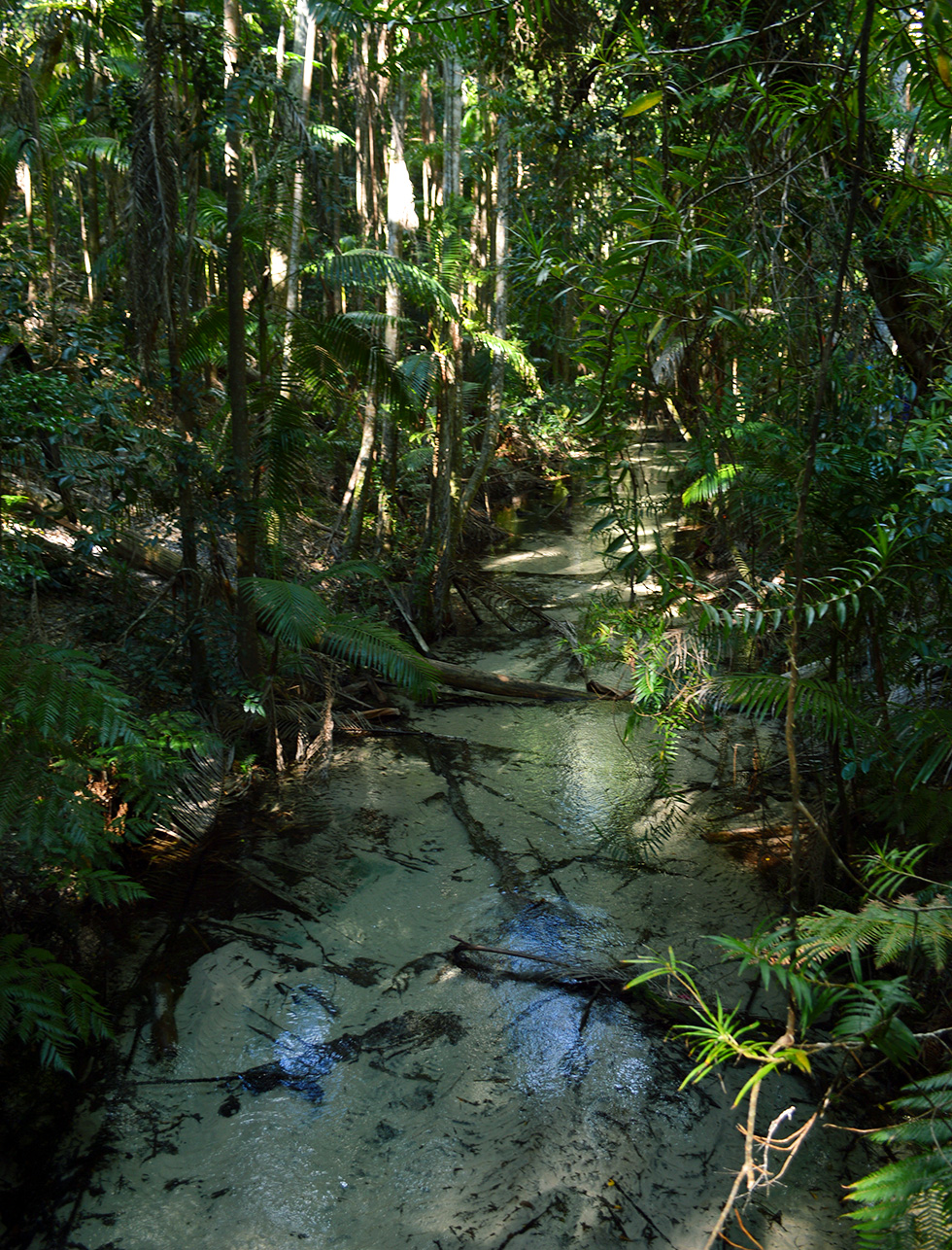 On s’est donc baladé un peu dans la forêt où coule une petite rivière d’eau douce… Au début on croyait que l’eau était boueuse… Mais que nenni, en fait l’eau est tellement transparente qu’on ne la voit pratiquement pas mais qu’on voit très bien le sable en dessous ! Ca nous a bien bluffé !