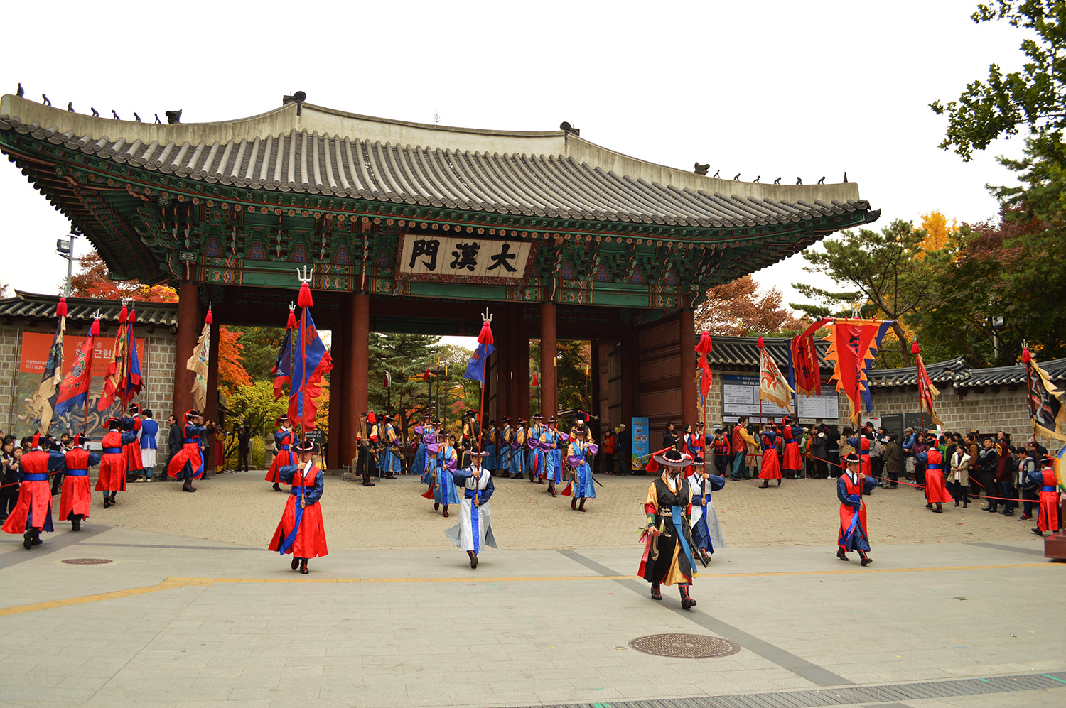Nous avons visité le palais Deoksugung (palais de la longévité vertueuse), celui-ci n’est pas très grand mais nous avons eu l’occasion de voir la « relève de la garde », avec des « gardes » en habits traditionnels. Ce qui diffère vraiment de nos palais européens, c’est que ce n’est pas un seul bâtiment (comme le Louvre par exemple) mais plusieurs, qui ont chacun une fonction. La chambre est donc dans un des bâtiments, la salle du trône dans un autre, etc. C’est assez étonnant !