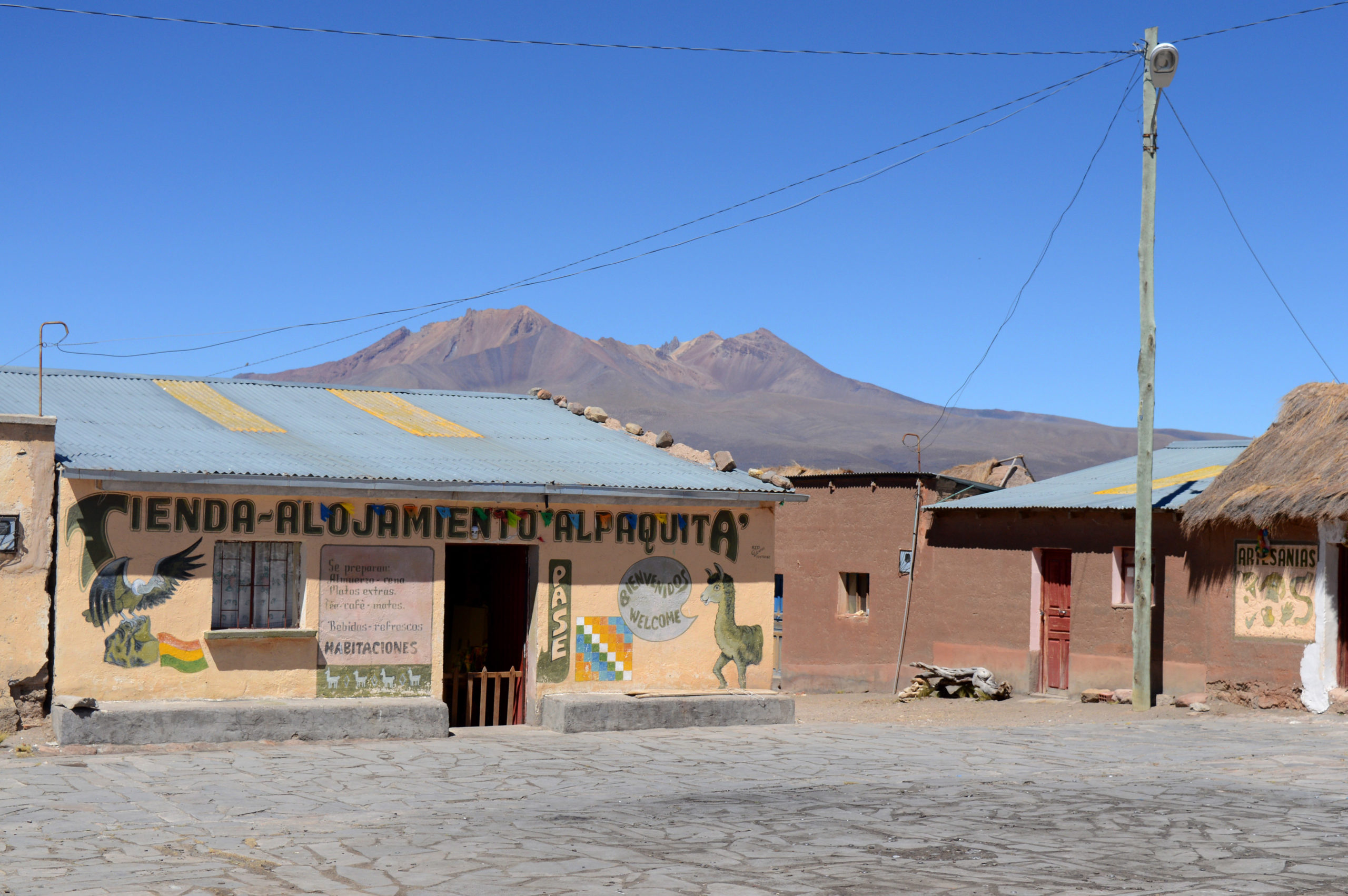 On arrive au petit village de Sajama, qui se situe en fait au milieu du parc du même nom. C’est très rustique, comme souvent en Bolivie. Il y a quelques hôtels et hébergements, nous trouvons une chambre double avec salle de bain privée et eau chaude, détail très important ici, car nous sommes à plus de 4 000 mètres et il fait frais !