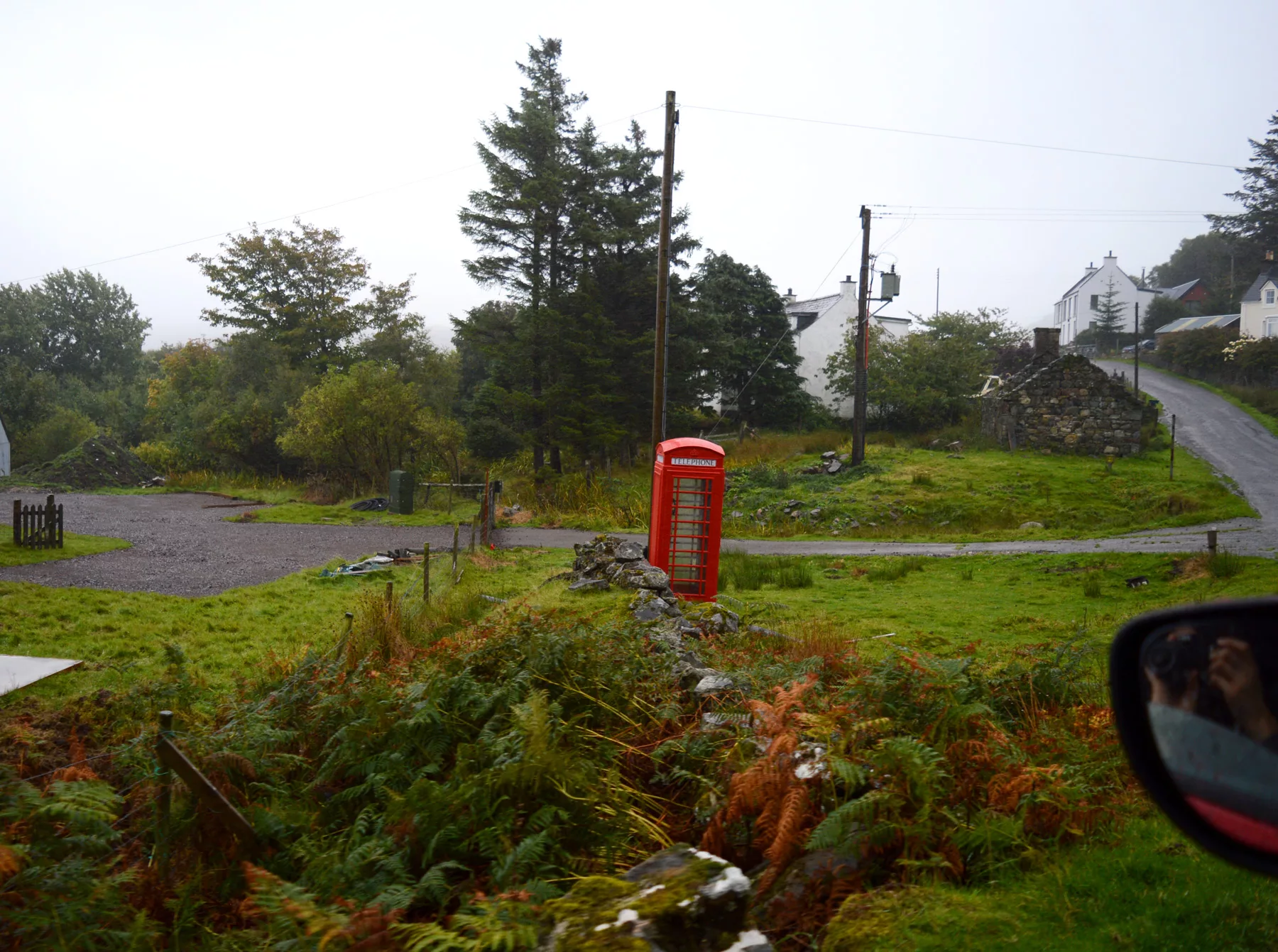 Comme il ne fait que pleuvoir et que c’est un peu râpé pour randonner, on décide de prendre la route en direction de Locchinver. Autant en profiter pour explorer les petites routes et voir de beaux paysages bien à l’abri. Et nous n’avons pas de regrets face à ce choix car cette petite route nous a offert de superbes lieux très sauvages ! On passe par de petits chemins qui traversent des hameaux. Certains ont toujours une vieille cabine téléphonique rouge (le contraste avec le paysage verdoyant est amusant) et on croise énormément de moutons mais aussi des vaches highland (avec de longs poils !)