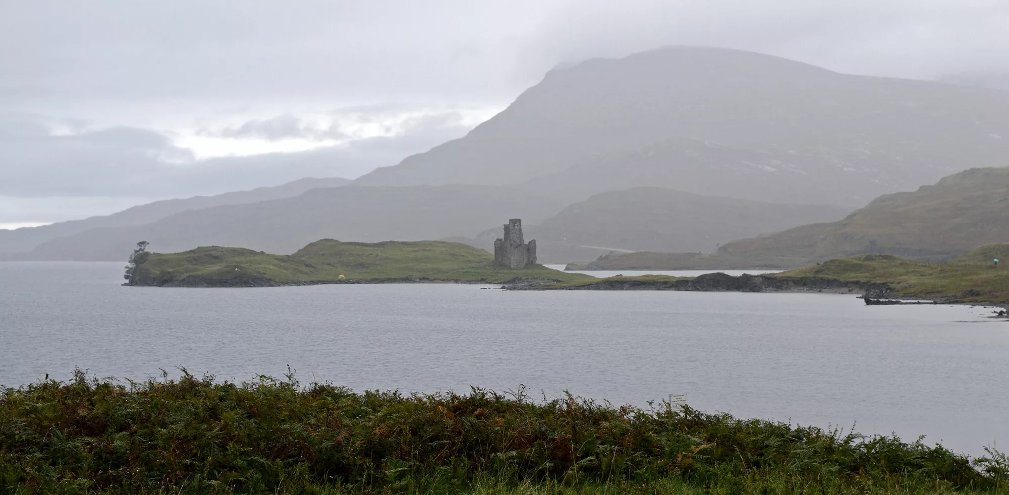 Nous arrivons à Ardvreck Castle, un château en ruines du XVIe siècle, réputé comme hanté. Le lieu est super photogénique, au milieu du loch Assynt, avec les montagnes autour… Nous en faisons rapidement le tour, sous la pluie, puis nous nous mettons vite au chaud dans la voiture. En face du château, nous pouvons voir Calda House, hantée également ! Le temps n’est pas optimal pour traîner dehors, mais l’ambiance est très fantomatique… Cette brume s’accorde à merveille avec les légendes des ruines qui nous entourent.