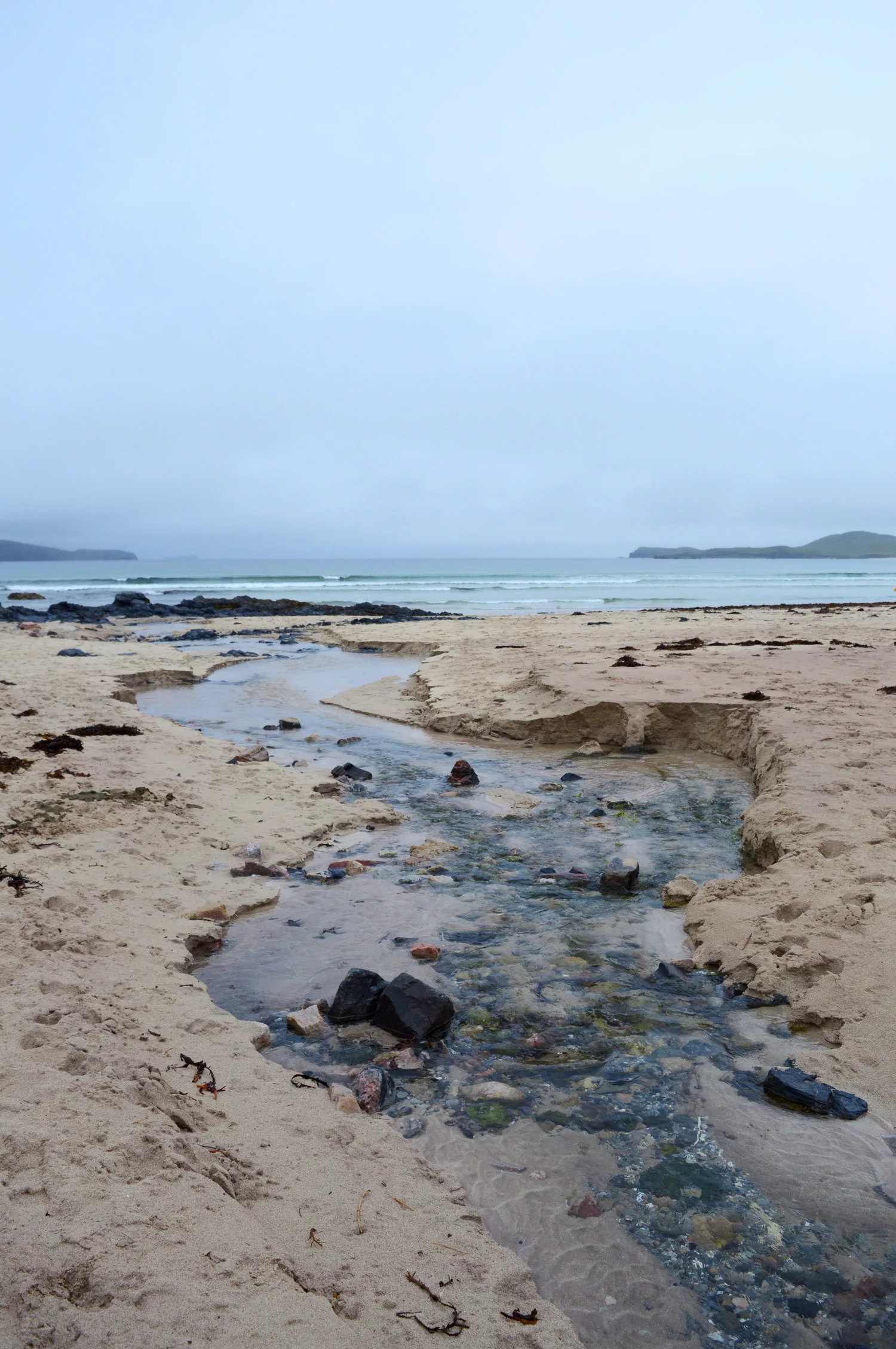 Nous faisons un arrêt à la plage de Clachtoll. La pluie s’est calmée et on en profite pour se dégourdir les jambes. Il y a une petite cabane avec plein d’infos sur les environs, la faune et la flore, l’histoire, la géologie… J’ai trouvé ça trop chou, un vrai travail de recherche à petite échelle ! Devant, on y découvre même le squelette d’une mâchoire de baleine. Il est possible de les observer passer par là à une certaine période.