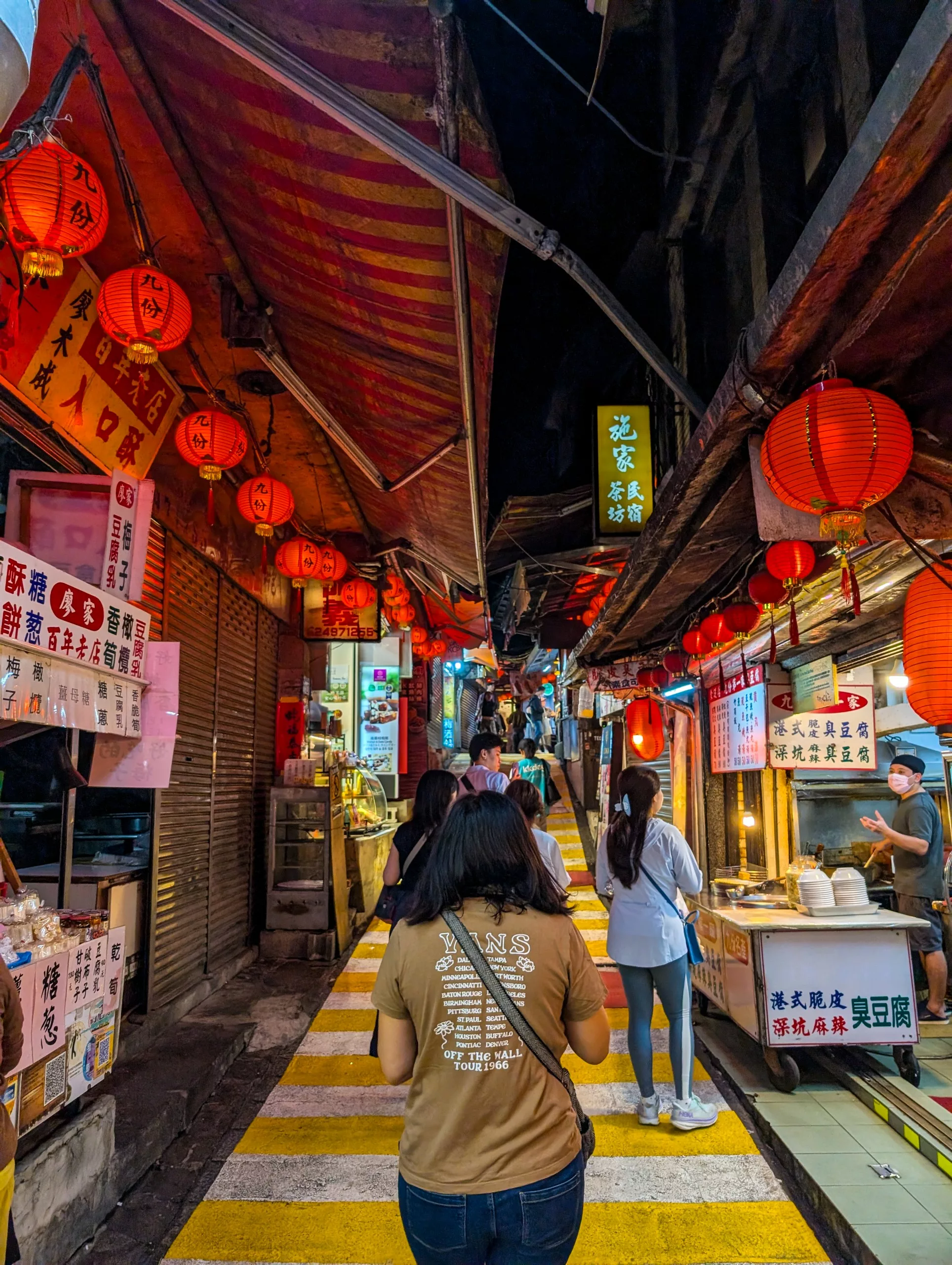 Après une bonne douche à notre hôtel, nous nous rendons au cœur de Jiufen, dans sa vieille rue : Jishan Street. On y arrive en soirée (vers 19 h 30), mais il y a encore énormément de monde, la rue est blindée. Jiufen est connu pour ses maisons de thé, malheureusement nous n’avons pas trop eu le temps de tester et avec ce monde, ça paraissait compliqué.
