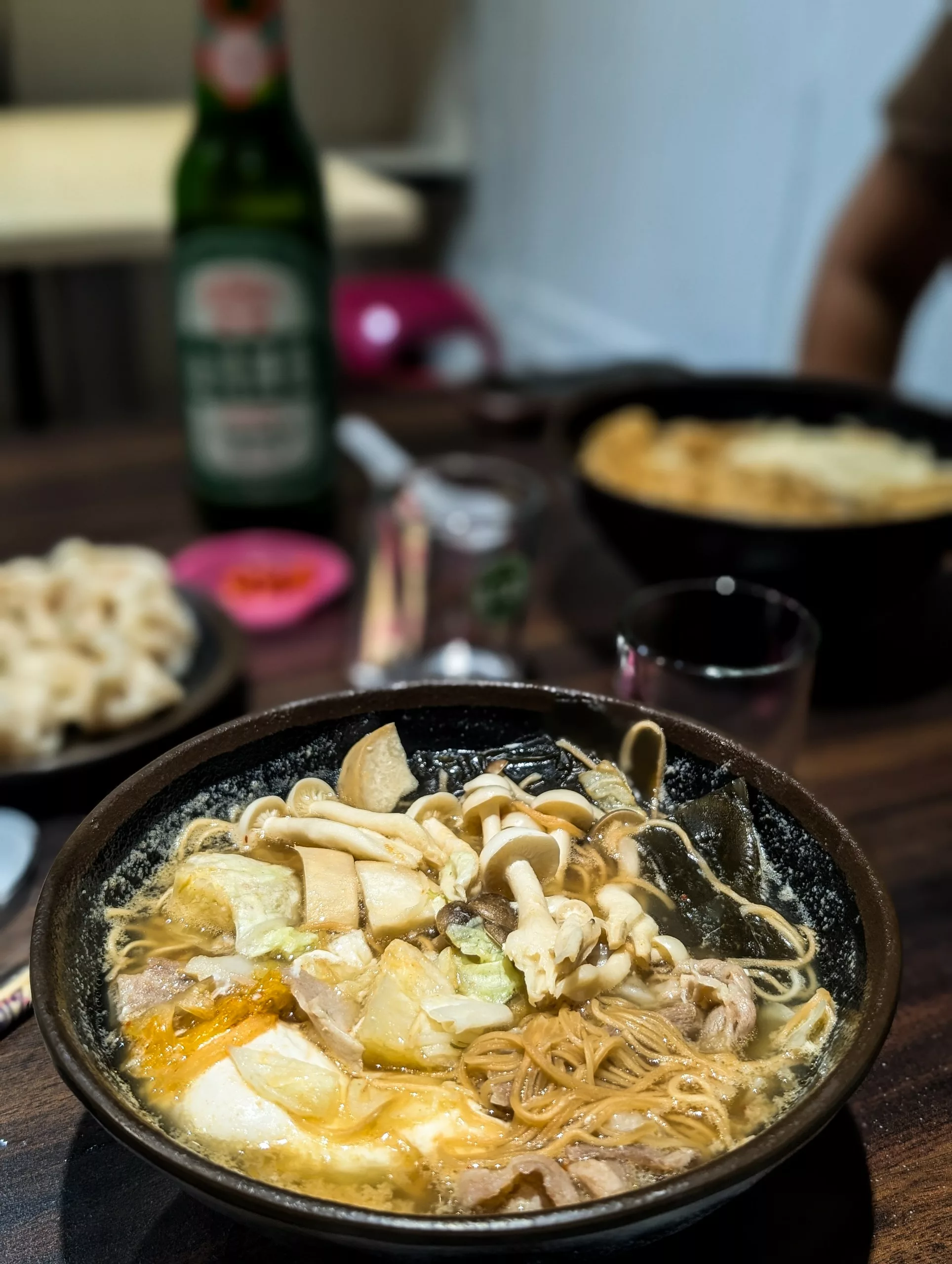 Il faut savoir que Jiufen est une ville « à étages », il y a énormément d’escaliers. Il ne faut donc pas avoir de problèmes moteurs. On se promène dans ce dédale, mais l’appel du ventre se fait ressentir alors on s’éloigne un peu de cette artère grouillante pour s’enfoncer dans une petite rue paisible. On tombe sur un minuscule resto, et comme il n’y a pas beaucoup de choix par ici, on s’y arrête. Cuisine familiale, on prendra chacun une soupe de nouilles (tofu pour moi, porc pour Manu), avec une bière taïwanaise.
