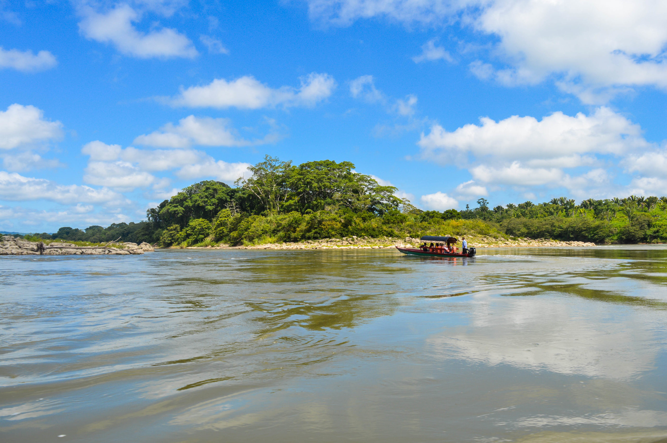 Nous partons très tôt, après 1 h 30 de route, nous faisons un arrêt p’tit dej, avec un énorme buffet à volonté. On repart ensuite pour encore 2 h de minibus sur des petites routes désertes avant d’arriver près d’un fleuve. Pour accéder à la cité maya de Yaxchilan, il n’y a pas d’autres choix que le bateau ! Après 30-40 minutes en lancha, on commence à apercevoir des ruines sur les bords de l’eau, en partie cachées par la jungle. Ça y est, nous sommes à Yaxchilan. On s’échappe du groupe (un peu trop nombreux à notre goût) pour profiter tranquillement des lieux, avec les indications du Routard. Après une petite marche sur un sentier au milieu des arbres, nous arrivons à un bâtiment qu’il faut traverser. Dedans, c’est tout noir et en éclairant avec nos portables nous tombons nez à nez avec des chauves-souris !