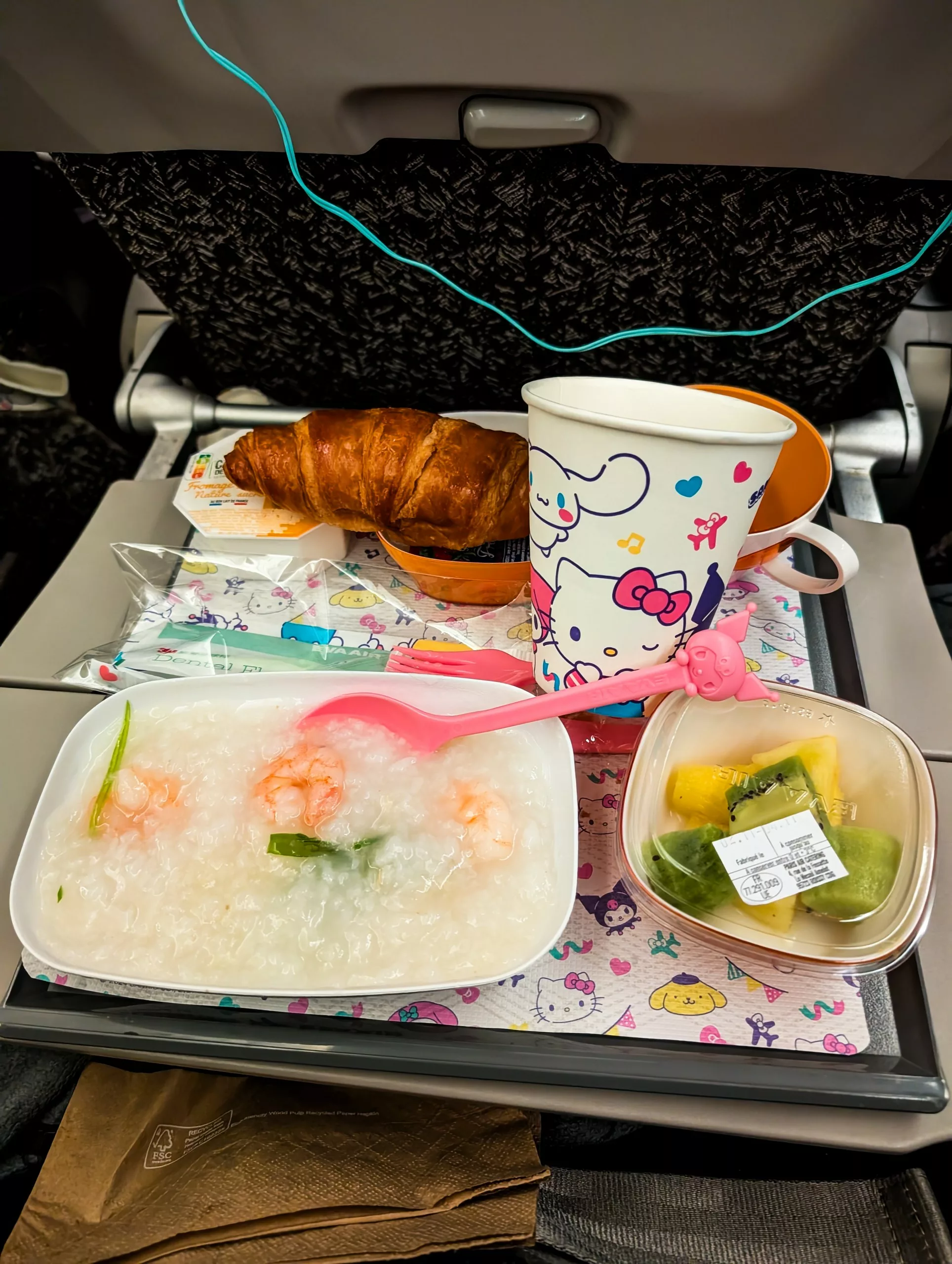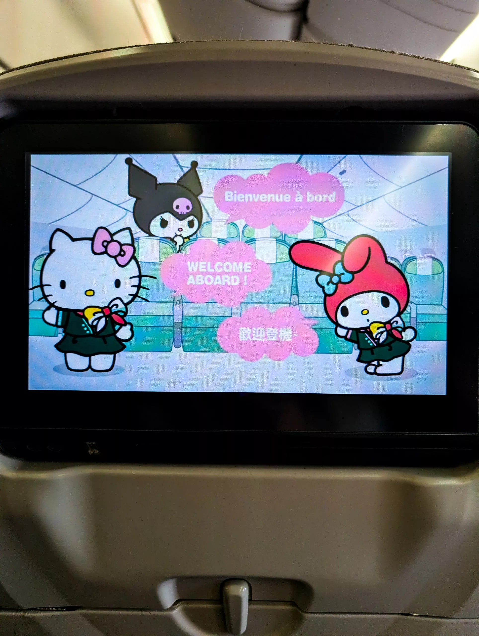 En avion, tiens ! 😝 Il y a des vols directs Paris Charles de Gaulle – Taipei Taoyuan avec Eva Air. C’est une compagnie taïwanaise, très bien notée. Nous avons fait ce trajet avec eux (13 h de vol) et tout s’est très bien déroulé. Ça nous a tout de suite mis dans l’ambiance, car la compagnie fait un partenariat avec les personnages Sanrio (dont la plus célèbre est Hello Kitty), nous avons donc eu droit à une carte d’embarquement sur ce thème… Et cela continue dans l’avion avec les écrans, les couverts pendant les repas, etc… Trop kawaï, on adore !