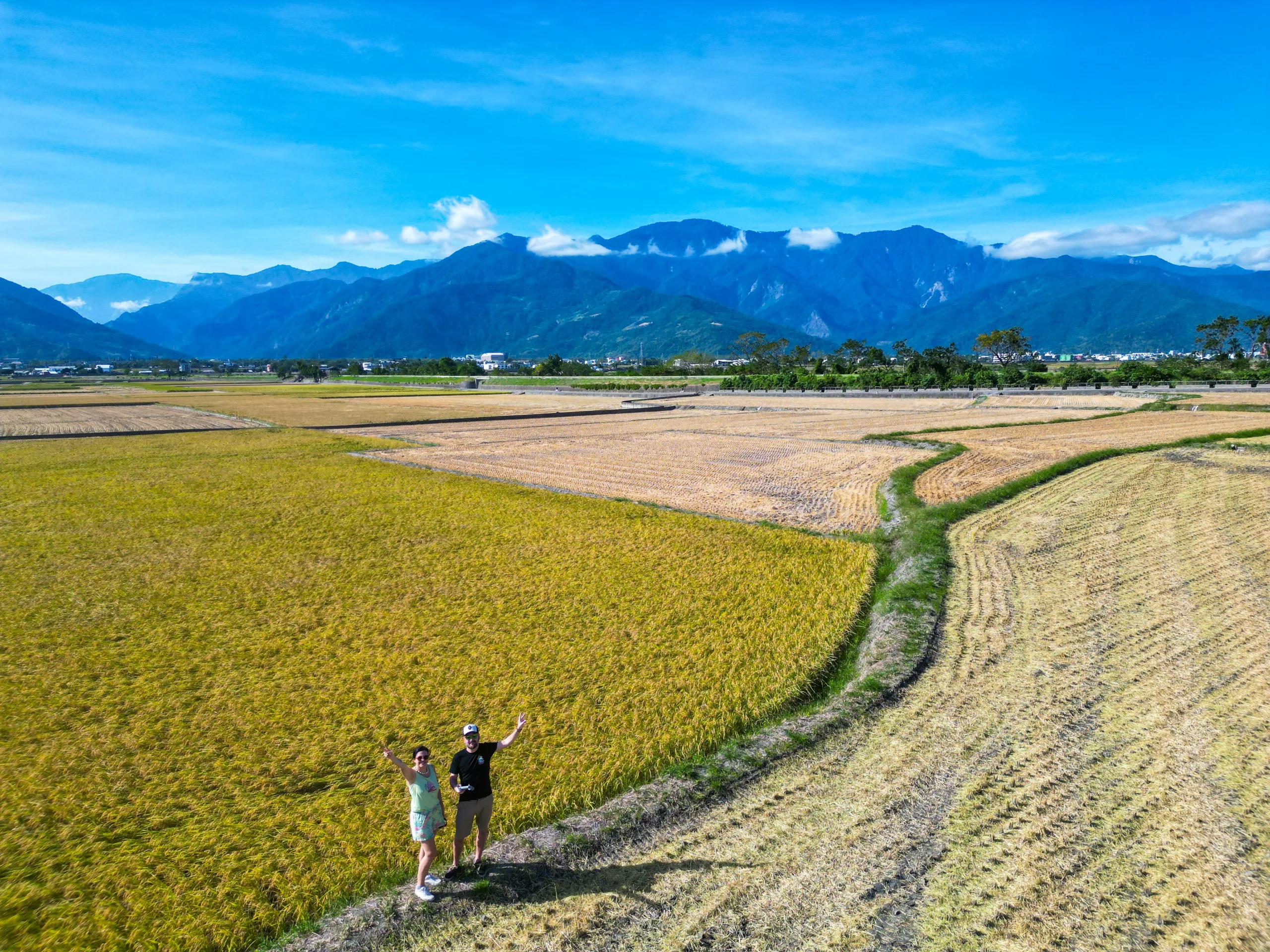 Mais cette étape à Taitung était avant tout l’occasion de visiter des rizières à Taïwan ! Pour cela, nous nous rendons à Chishang et louons des vélos là-bas pour nous promener au milieu des champs de rizières entourés de montagnes. C’est un endroit vraiment magnifique, un gros coup de cœur !