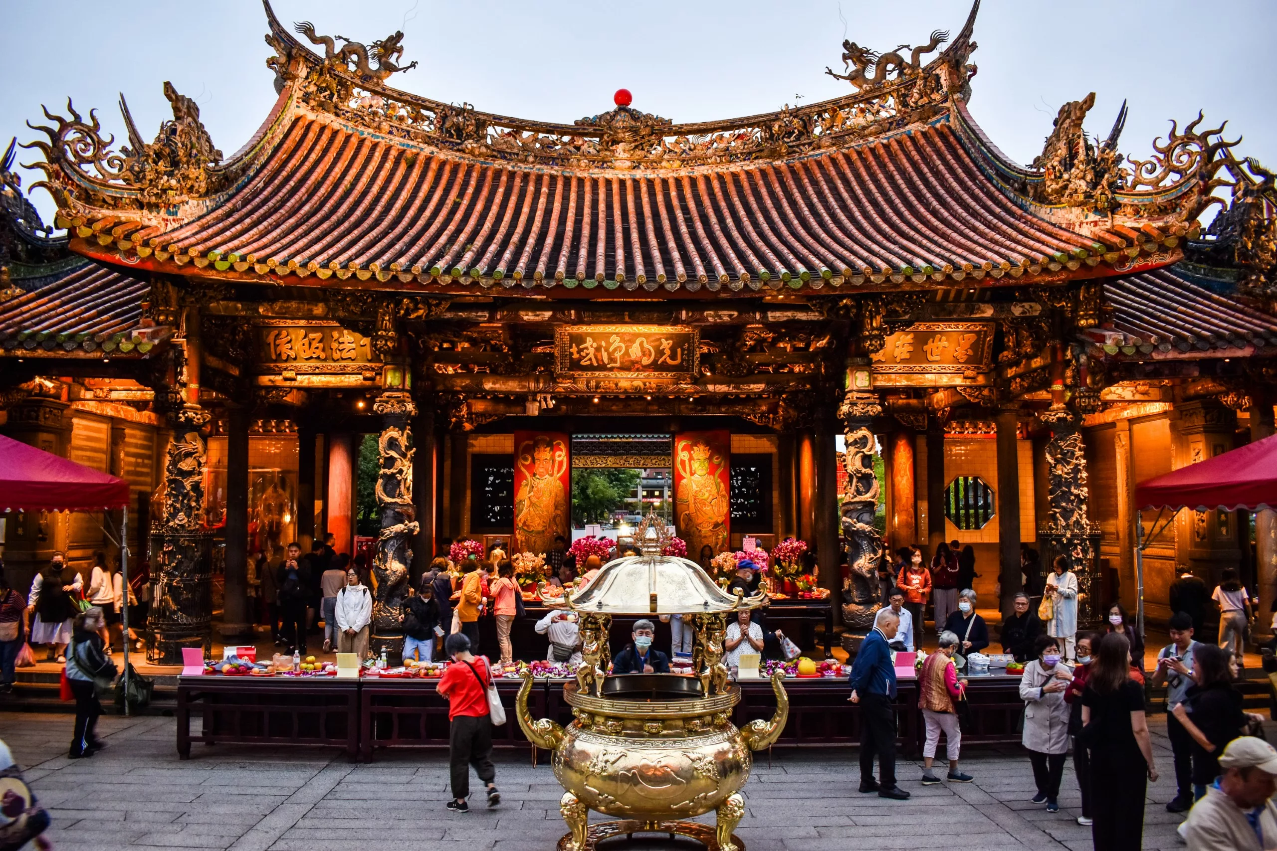 - Le temple Longshan. Cérémonies de 6 h à 6 h 45, 8 h à 8 h 45 et 15 h 45 à 17 h. Plus de monde à ce moment-là, mais c’est beau à voir ! Temple à visiter en journée et la nuit pour ses éclairages.